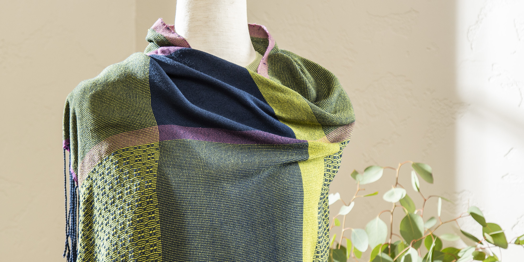 この記事では、春のワードローブに新鮮でドレープ感のあるラップを加えるための手織りプロジェクトを紹介しています。特に、コントラストの効いた色使いが「ブロンソンレース(Bronson lace)」の織り模様を際立たせる点が強調されています。