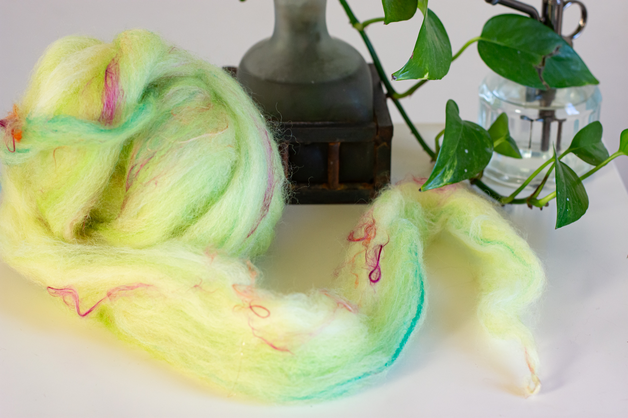 ディズを使ってロービングを取り出すプロセスは、いくつかのステップに分かれます。まず、ドラムカーダーのドラムにカードされた繊維のバットがしっかりと形成されていることを確認します。次に、ディズの穴(通常は複数の異なるサイズの穴が開いている)の中から、作りたいロービングの太さに最も適した穴を選びます。ディズをドラムの表面に軽く当て、バットの端から少量の繊維をディズの穴に通します。この際、繊維が均一に穴を通過するように注意深く引き出します。一度繊維が穴を通り抜けたら、ディズをドラムから少し離し、一定のテンションを保ちながらゆっくりと引き下げていきます。これにより、ドラム上のバットがディズの穴を通して連続したロービングとして剥がされていきます。この作業中は、ディズをドラムの表面に対して常に垂直に保ち、一定の速度で引き出すことが重要です。途中で繊維が詰まったり、ロービングが途切れたりした場合は、一度作業を中断し、詰まりを取り除いてから再度慎重に引き出しを再開します。最終的に、ドラム上のバット全体が一本の長いロービングとして取り出されます。このロービングは、そのまま手紡ぎに使用したり、さらに複数の色をブレンドしたりするのに適しています。