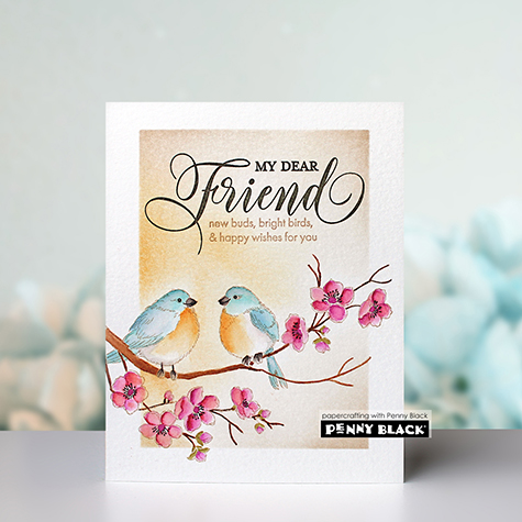 * 水彩で描く青い鳥のカード: Jillさんの作品は、薄いインクでスタンプした青い鳥を水彩で着色し、柔らかく美しい仕上がりになっています。縁をマスキングテープで囲んでインクを塗ることで、きれいなフレームを作成し、茶色のインクでメッセージをスタンプしています。