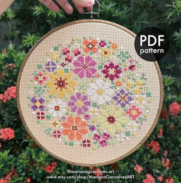 - Mariana Gonclaves ARTのフローラルデザインを参考に、季節の花をテーマにしたクロスステッチ作品を制作してみましょう。