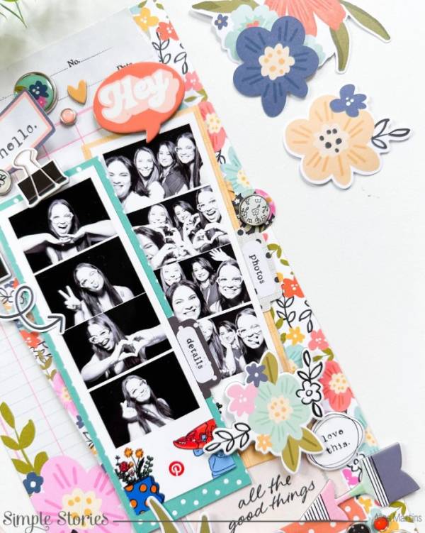海外メディアの記事「12 Scrapbook Layouts with Photo Strips Inspiration」は、インスタントカメラやフォトブースで撮影されたようなフォトストリップをスクラップブックのレイアウトに効果的に取り入れるアイデアを12種類紹介しています。特に、Aline氏の作品は、縦長のフォトストリップを活かしたレイアウトが特徴です。彼女は、白黒やセピア調のフォトストリップを使用することで、背景の華やかなフローラルパターンとのコントラストを際立たせています。これにより、本物のフォトブース写真のようなレトロな雰囲気を演出し、視覚的な魅力を高めています。このアプローチは、写真そのものの魅力を引き出しつつ、スクラップブック全体のデザインに深みと物語性を加える効果があります。