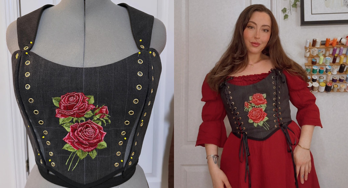 本記事は、BERNINAアンバサダーであるジェシカ・クローニン氏による、古いジーンズを美しいバラの刺繍モチーフをあしらったトレンドのデニムボディス(身頃)にアップサイクルするステップバイステップのチュートリアルを紹介しています。このプロジェクトは、着なくなったジーンズを再利用し、ファッションアイテムとして生まれ変わらせることで、サステナブルなクラフトを楽しむことを目的としています。