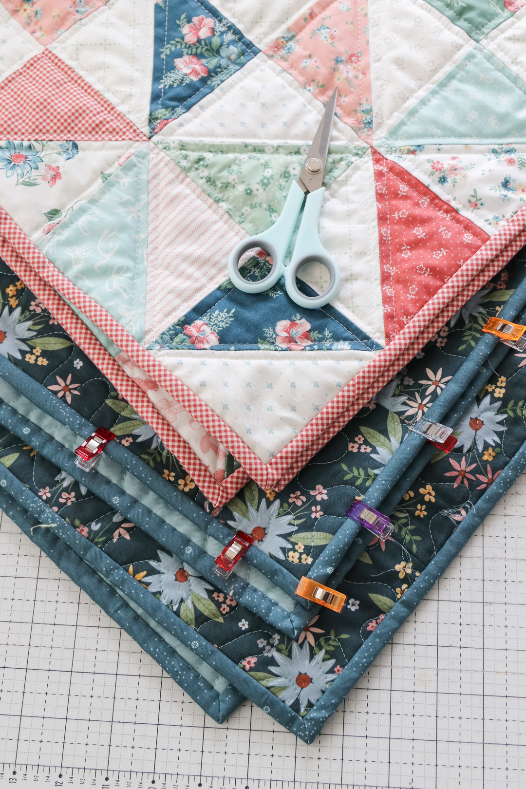 - キルトバインディングは完成度を左右する重要な工程です。複数のキルトのバインディングをまとめて行うことで、効率的に作業を進められます。
